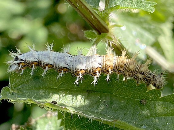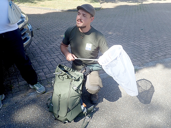 Na deze introductie en kennismaking met elkaar gingen we daadwerkelijk aan de wandel. De verrekijkers werden in gereedheid gebracht, het vlindernet uitgeklapt en hup richting park. Maar nog voordat we daar waren, zagen we al een prachtige zonnende Blauwe reiger en meerdere soorten zweefvliegen bij een bloeiend Koninginnekruid (Leverkruid). In de Grote brandnetel langs het pad zat een rups van de Gehakkelde aurelia te eten. Een Gewone zakdrager, de larve van een klein motje, vonden we op een braamblad. Meerdere Grote keizerlibellen scheerden over het water. We vonden een Houtpantserjuffer op een tak en een Lieveling in het gras. Bonte zandoogjes, Klein koolwitje en Atalanta vlogen voorbij. De deelnemers waren verbaasd wat we allemaal zagen. Eenmaal in het park vertelde Kevin over de sapstroom van een Spaanse aak. Direct onder de bast zit het levende deel van een boom, maar helemaal in het midden van een stam is er eigenlijk een dood deel. Dat zie je bij knotwilgen ook goed. De hele binnenkant is weg, maar toch leeft de boom nog. Nu begrijp ik hoe dat kan. Maar we zagen ook een Cosmea en een Korenbloem, allebei planten die er eigenlijk niet thuishoren, die zijn hoogstwaarschijnlijk ingezaaid.