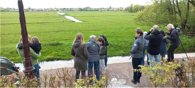 ... met de commissie natuur van de Vereniging tot Behoud van de Wilmkebreekpolder. Er zijn verrekijkers en telescopen, maar neem ook je eigen verrekijker mee als je die hebt. We zien allerlei weidevogels, de kieviten hebben al pullen; we geven uitleg over het gedrag van de vogels, over weidevogelbescherming, over bedreigingen voor de weidevogels, enz.