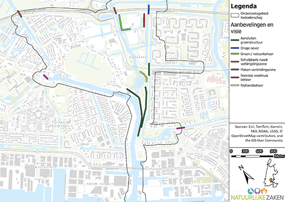 - Verbeter de verbindingen: De wateren, sloten en groene zones vormen het netwerk van de Kadoelerscheg. Deze moeten behouden blijven en waar mogelijk versterkt worden.