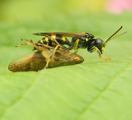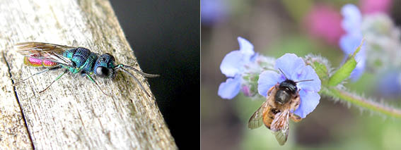 Een parasiet zoals het prachtige Goudwespje maakt gebruik van het broedsel van de Metselbijtjes in het insectenhotel. Neem even de tijd bij het insectenhotel, het groen/blauwe metaalkleurige wespje hangt er vast nerveus in het rond wachtend op het juiste moment om een eitje te leggen bij het broedsel van de Metselbij. De rest laat zich wel raden: een parasitaire relatie! Gelukkig worden niet alle celletjes besmet! Er blijven genoeg Metselbijtjes en Goudwespjes over. Sommige soorten wespen zijn goed herkenbaar als je ziet welke prooien ze voor hun nageslacht zoeken, zoals de Cicadendoder.