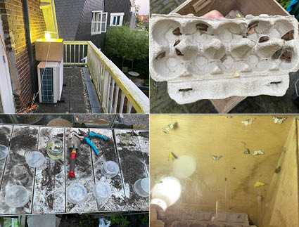 Het meeste succes leverde de val als hij net vóór, tijdens of na nieuwe maan werd gezet. Daarom ging de buitenverlichting van het huis uit, want hoe donkerder hoe beter! En ik hield verschillende omstandigheden in de gaten. Waait het niet harder dan windkracht 3? Is de nachttemperatuur wel boven de 10 graden? Blijft het droog? De beste plek bleek op de warmtepomp op het balkon te zijn aan de achterkant van het huis, waar er geen lichtvervuiling is van straatlantaarns en zo. Zodra het ’s morgens licht werd, controleerde ik de val en begon met het fotograferen van de nachtvlinders die buiten de val, vaak op de gevel van het huis, zaten. De gevel staat op het westen en houdt de warmte van de ondergaande zon goed vast. Soms vond ik daar ’s morgens wel 10-15 uilen, spanners en andere nachtvlinders. Dan gaat de lamp uit en wordt de val gesloten. Voorzichtig breng ik hem naar de kas, want geregeld ontsnappen ze. En eenmaal buiten zijn ze weg. Bladrollers, motten en spanners fladderen ergens naartoe en zijn dan bijna altijd spoorloos verdwenen. En uilen laten zich vaak pardoes vallen en kruipen direct weg tussen de bodemplanten. Soms vind je die nog. Pijlstaarten kun je langzaam op een stokje laten kruipen en die blijven daar de hele dag stil zitten tot het weer donker genoeg is. Die kun je dus de hele dag blijven bewonderen. Ik open dus voor de zekerheid de val in de kas. Daar staan ook een paar kleine plastic bakjes klaar, waar ontsnapte vlinders korte tijd vastgehouden kunnen worden.