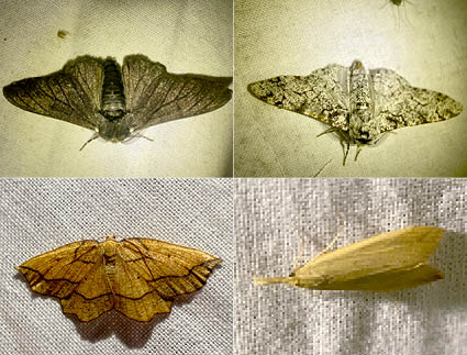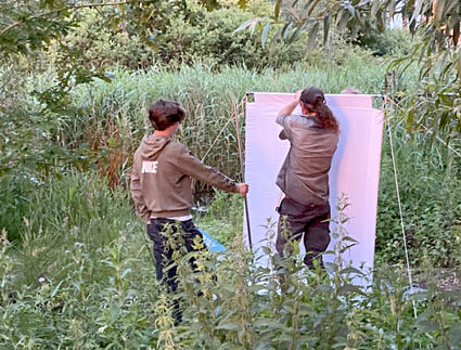 Met mijn LED-emmer, een volle tas en paraplu ging ik naar het gemaal. Daar gingen we nachtvlinderen. Ik had afgesproken dat ik rond 12 uur thuis zou zijn, want een uurtje naar een wit doek staren en motten zoeken, leek me wel genoeg. Koen stond al te wachten. Edo en Floor kwamen al snel aangereden en tenslotte arriveerden ook Tello en Harry. De vallen werden opgezet. Dat zijn eigenlijk lakens met een felle lamp erop. Een kleiner laken werd iets uit het zicht in een verborgen hoek gezet. En twee kisten werden opgesteld. Dat zijn houten vallen met een plexiglas trechter vol met eierdoosjes, waar de nachtvlinders zich onder kunnen verschuilen. Tja, en waar kon ik dan met mijn LED-emmer heen? Bij al het geweld van felle lampen zou dit zwakke UV-licht niet opvallen. Dus heb ik het maar ergens tussen de struiken gezet, ervan uit gaande dat het wel niet veel zou opleveren.