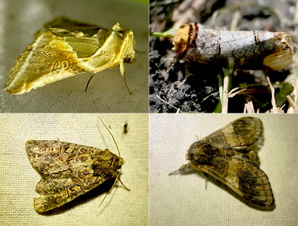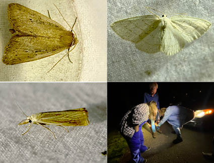 De lamp brandde al even en in no time zat het laken vol met dans- en steekmuggen, vliegjes en kleine kevertjes. Terwijl ik verbaasd naar dit snelle resultaat stond te kijken, werd bij het kleine laken geroepen dat er een Hopwortelboorder was waargenomen. Ik er naartoe en daar zat een prachtige en grote oranjeachtige vlinder. Een vrouwtje bleek later, want niet veel later was er op het andere laken een man gevonden. Deze is iets kleiner en witter. Deze nachtvlinders worden al in de schemering actief. De rups leeft van de wortels van de hop. Wat een specialisatie. Je weet het eigenlijk al als je de naam van het beestje kent. En de rest van de avond zou vaker blijken dat spanners, rollers of uilen monofaag kunnen zijn, dus gespecialiseerd op één waardplant. Zo vonden we later ook de Witkraagrietboorder. Dit is een vrij zeldzame uil waarvan de rups in stengels van oud riet leeft. Dus als je deze vlinder op je laken krijgt, dan betekent het dat er overjarig riet in de buurt moet zijn. Op zich is dat een goed teken, want dat is gunstig voor de biodiversiteit.