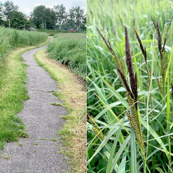 Aan de slootkant staat Gele lis en Riet, maar er staat ook Rietgras dat er net iets anders uitziet dan Riet. Een duidelijk verschil is het vliezig tongetje bij Rietgras i.p.v. het harig tongetje zoals bij Riet. Ook staat in het meest natte gedeelte veel Oeverzegge. Oeverzegge is een forse zegge die vroeg bloeit met haast zwarte, mannelijke pluimen.