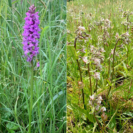 Iets verder weg van het talud is een vrij open en lage vegetatie die heel bijzonder is. Het is er drassig en er groeien veel mossen. Hiertussen staat Gewoon reukgras, Grote ratelaar, Zeegroene rus en de zeldzame Moeraswespenorchis. Een kwetsbare rode-lijst-soort die wettelijk beschermd is. Het voorkomen op deze plek heeft waarschijnlijk te maken met de basenrijke kwel van water uit het kalkrijke talud. Er staan talrijke exemplaren bij elkaar doordat deze orchidee een uitgebreid stelsel van vertakte wortelstokken heeft. Deze orchidee bloeit juni-juli. Het is een kwetsbare orchidee in een kwetsbare vegetatie, dus loop hier niet zomaar het veld in.