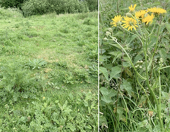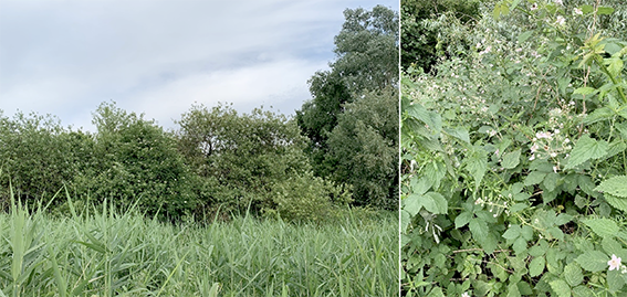 In het zuiden staat hier behalve Brandnetel veel Reuzenberenklauw en Reuzenbalsemien. Reuzenberenklauw is een invasieve exoot die wel 3 meter hoog kan worden en de plant bevat stoffen die op de huid ernstige brandwonden kunnen veroorzaken. Hij wordt daarom bestreden en weggemaaid, maar is nu niet meer gemakkelijk weg te krijgen. Ook de Reuzenbalsemien is een invasieve exoot en moet volgens de wet bestreden worden omdat hij de natuurlijke vegetatie verdringt.