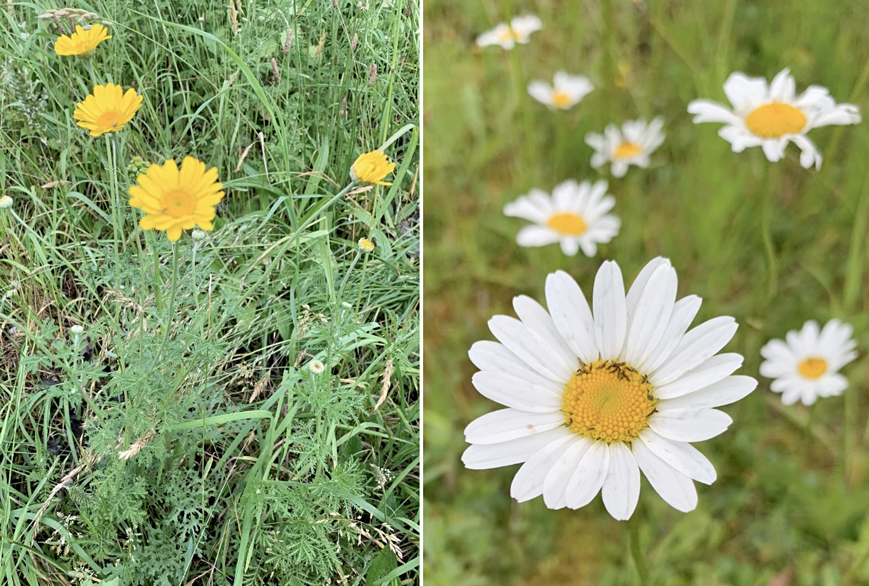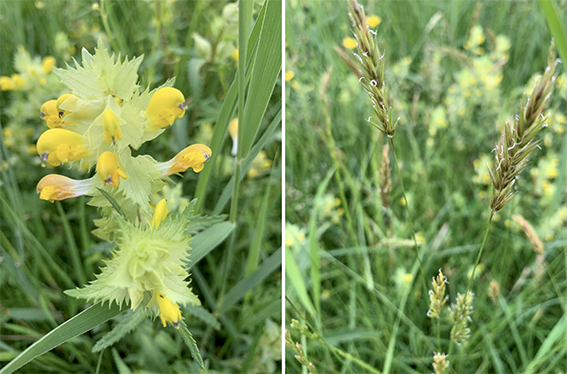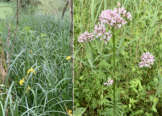 Als we nu verder langs het water lopen waar geen struiken meer groeien, dan staan we weer in een vegetatie van kruidig en vochtig grasland met Grote ratelaar en Gewoon reukgras. Het is maar een klein stukje, maar plotseling een heel andere vegetatie. Uiteindelijk komen we bij het talud van de IJdoornlaan. Een talud van aangebrachte grond die droger is met soorten als Margriet en Gele kamille.
