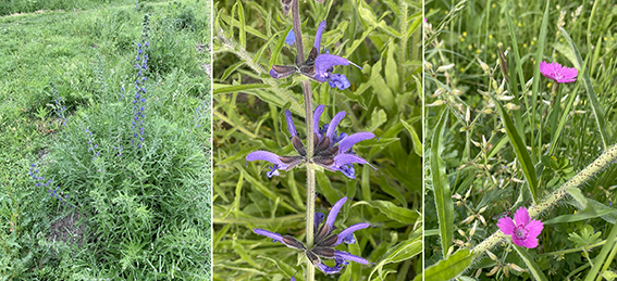 Lopen we weer terug over het fietspad naar het zuiden dan komen we door een mozaïek van verschillende typen vegetatie. Er staan ongemaaide stukjes met vochtige graslandvegetatie met daarin Echte koekoeksbloem, Glad walstro en zelfs Gele lis. Maar hier staan ook andere soorten die goed tegen maaien kunnen, zoals Groot streepzaad. Waar zand is opgebracht lijkt het meer op een duinvegetatie. Het gras is kort afgegraasd (door konijnen) met daartussen Jacobskruiskruid. Jacobskruiskruid is licht giftig voor konijnen en wordt door hen gemeden. Langs het fietspad staan verder Steenanjer en Veldsalie (beide zeldzaam, maar hier waarschijnlijk verwilderd) en het blauw bloeiende Slangenkruid, een pioniersplant die juist weer goed gedijt op droge en kalkrijke (zand)grond.
