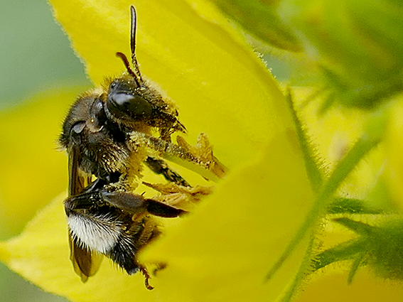 25 juni: Gewone slobkousbij. Als je Puntwederik of beter nog Grote wederik in de tuin hebt, dan is daar zeer waarschijnlijk ook deze donkere bij te vinden van 7-8 mm. Vooral het vrouwtje is opvallend met witte haren op haar achterpoot, waarmee ze de stuifmeel en olie uit de bloem verzamelt en naar haar nest kan brengen. Grote wederik groeit in vochtige aarde en daar maakt deze bij ook haar nest. De olieachtige substantie uit de bloem beschermt haar nest tegen water.