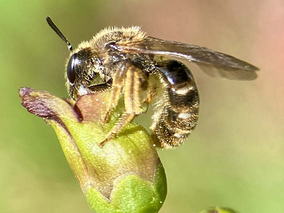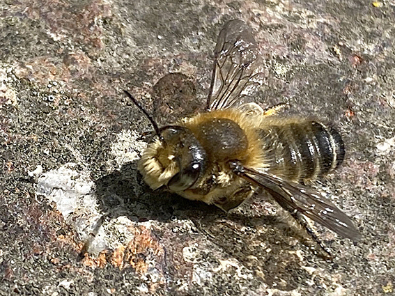 10 april: Groefbij. Er zijn veel soorten groefbijen en de bij op de foto is waarschijnlijk een bandgroefbij, maar ook daarvan zijn er meerdere soorten. Het is lastig om ze goed op naam te krijgen en dat is me in de jaren dat ik insecten fotografeer nog niet één keer gelukt. De groef is centraal geplaatst op het laatste deel van het achterlijf. (Op deze foto niet te zien.)