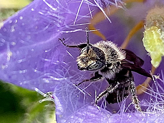 20 mei: Grote klokjesbij. Vorig jaar heb ik Ruig klokje gezaaid en nog voor de winter al flinke planten geplaatst. Die staan dit jaar te bloeien en worden dankbaar bezocht door de Grote klokjesbij. Er vliegen soms wel 10 bijtjes rondom de stengels met bloemen. Je kunt ze dus op deze manier makkelijk naar je tuin lokken.