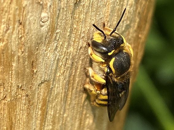 26 mei: Grote bladsnijder. Het mannetje op de foto zit even te zonnen. Hij is actief van half mei tot eind augustus en foerageert op rolklavers, distels, klokjes en Wilgenroosje. In het bijenhotel zit ie graag te slapen en zit dan met zijn kop naar de uitgang.