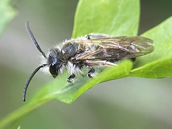 26 mei: Fluitenkruidbij. Ook dit is een eerste waarneming. Ze zijn van begin april tot eind juli te vinden. Dit jaar staat het Zevenblad uitbundig te groeien, want op hun schermbloemen zitten een breed scala aan insecten. Ze foerageren ook op andere schermbloemigen zoals Fluitenkruid, Berenklauw en Kervel. De Fluitenkruidbij is een zandbij. Daarvan zijn er in Nederland ongeveer 80 soorten. Het voordeel van een nest bouwen in de grond is dat het klimaat onder de grond redelijk stabiel is. Je hebt als bij dan wel een inwendige wekker nodig om te weten wanneer je het volgende jaar weer naar buiten moet.