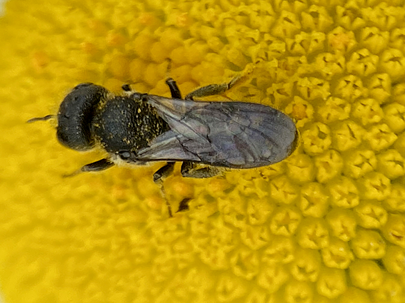26 mei: Wormkruidbij. De wormkruidbij is een zijdebij en dat refereert aan het materiaal dat het vrouwtje aan de binnenzijde van het nest in de grond maakt. Die is schimmelwerend en waterafstotend. De bij is onderdeel van drie erg op elkaar lijkende soorten en dat wordt dan een soortencomplex genoemd. Ze foerageren op Boerenwormkruid, maar ook op Duizendblad, Kamille en Margriet. Je kunt ze vinden van eind mei tot eind september. Het was dus een vroege vondst.