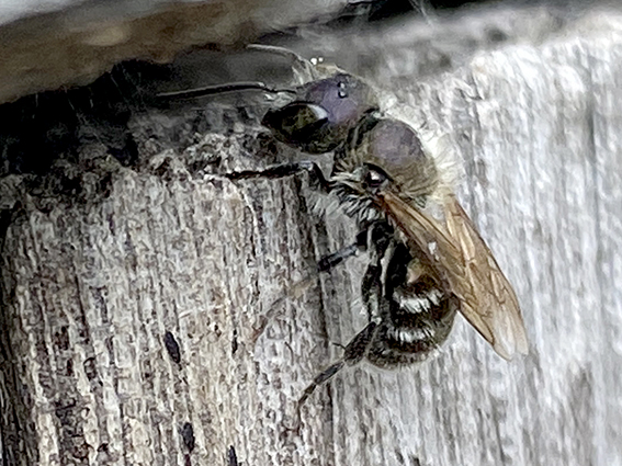 14 juni: Blauwe metselbij. Na een paar jaar weggeweest weer gezien in de buurt van een mogelijke nestholte. Dat kunnen allerlei soorten gaten en holen zijn. Ze foerageren op Hondsdraf, Kattenkruid en andoornsoorten.