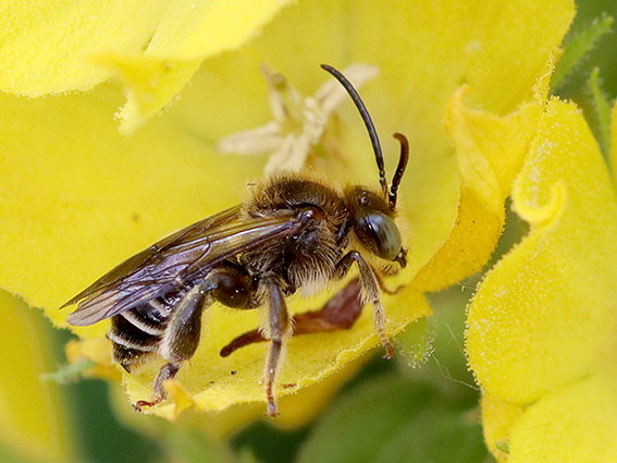 03 juli. Geurgroefbij. Er zijn in Nederland twee soorten geurgroefbijen die op foto nauwelijks van elkaar te onderscheiden zijn. Ze heten zo omdat het vrouwtje een zoete geur verspreidt, maar wat de functie daarvan is, dat kan ik niet vinden. Wellicht heeft het te maken om er mannetjes mee te lokken. Om hun nest te maken, zoeken ze een lichte, zanderige bodem. Op de foto is een Geurgroefbij te zien op Knopig helmkruid, maar ze foerageren vooral op gele composieten, Braam en Sporkehout. Dit is een klein bijtje van slechts 6 mm.