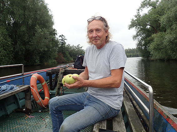 Kevin loodste ons de smalle sloot in van de Kadoelerbreek richting Kadoelenweg en het leek wel of we in de oerwouden van Brazilië zaten. Een IJsvogel scheerde langs en we vonden een flinke kist in de smalle sloot, we dachten aan een viskist, maar het bleek een open krat te zijn, misschien wel een grote oude hondenmand. Langs de oevers konden we grote groepen Staartmezen en andere soorten mezen zien en horen vliegen. Een overvliegende Buizerd werd achternagezeten door Zwarte kraaien en we zagen dat er veel soorten oeverplanten van voedselrijk water aanwezig zijn: Kleine lisdodde, Riet, Kattestaart, Wolfspoot, Moerasandoorn, bramen. Aan bomen zagen we o.a. de Eenstijlige meidoorn, de Zwarte els, de Zachte berk, wilgen en de Zomereik. Maar ook een Appel, die boom zat vol met grote geelgekleurde appels, we hebben er een stuk of vijftien geplukt voor eigen gebruik. Een echt moerasbos-habitat waarbij de Zomereiken en de Appel natuurlijk een beetje uit de toon vielen.