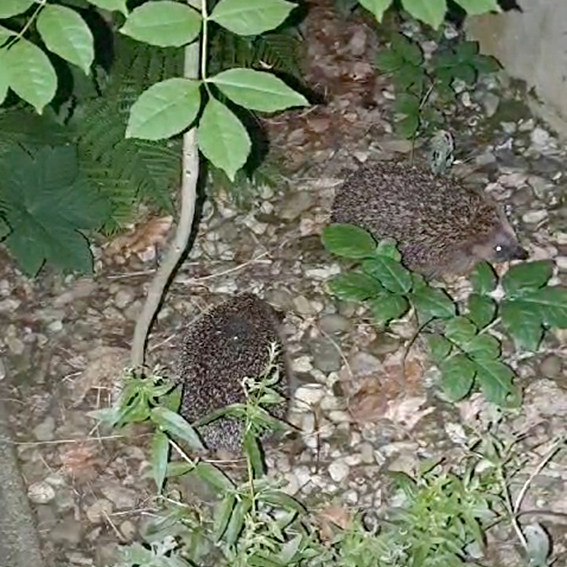 Harald: "Deze egels zijn altijd samen en zitten op deze foto bij de buren. Ze krijgen kattenbrokjes met vlees en schoon water. Nooit melk!, want daar worden ze ziek van.