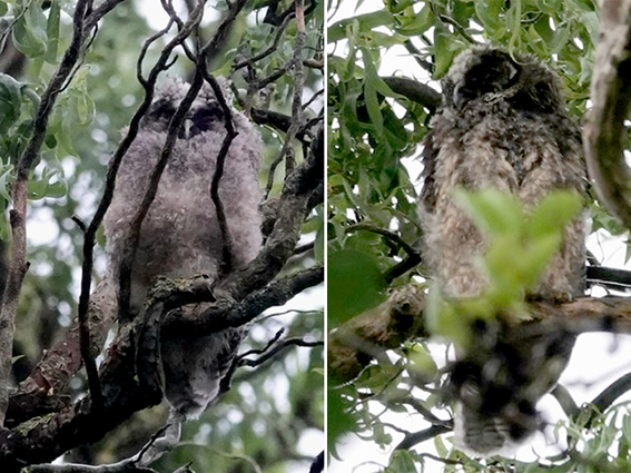 De avond erna ben ik voor het donker werd, gaan turen in de bomen zodra ik het gegil weer hoorde, want het geluid was zo dichtbij, ik zou de jongen nu toch ook moeten kunnen zien. En ja hoor, eerst een en toen de tweede: fluffy frummels wiebelend op takken hoog in de boom. Voorzichtig kleine stukjes vliegend van tak naar tak. Vliegles boven mijn hoofd.