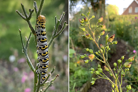 In de voedseltuin van het Jacob Groenplantsoen zijn twee rupsen van de helmkruidvlinder waargenomen. Deze opvallende rupsen hebben zwarte stippen en gele banden op een lichtgroene ondergrond. De rupsen waren zo’n 5 cm lang. Ze zaten bovenaan de bloemstelen van knopig helmkruid (Scrophularia nodosa) waar ze van de knoppen aten.